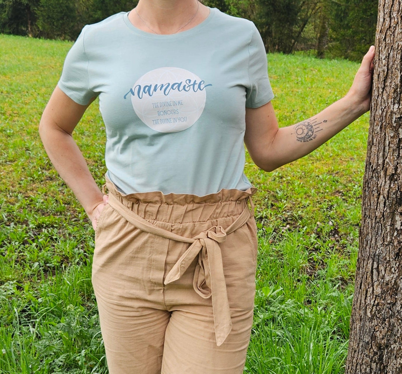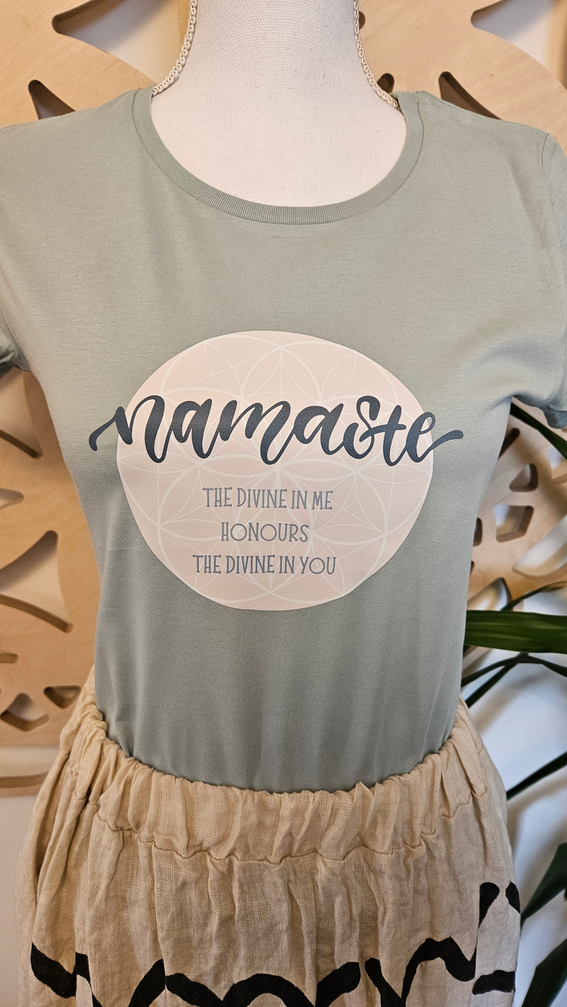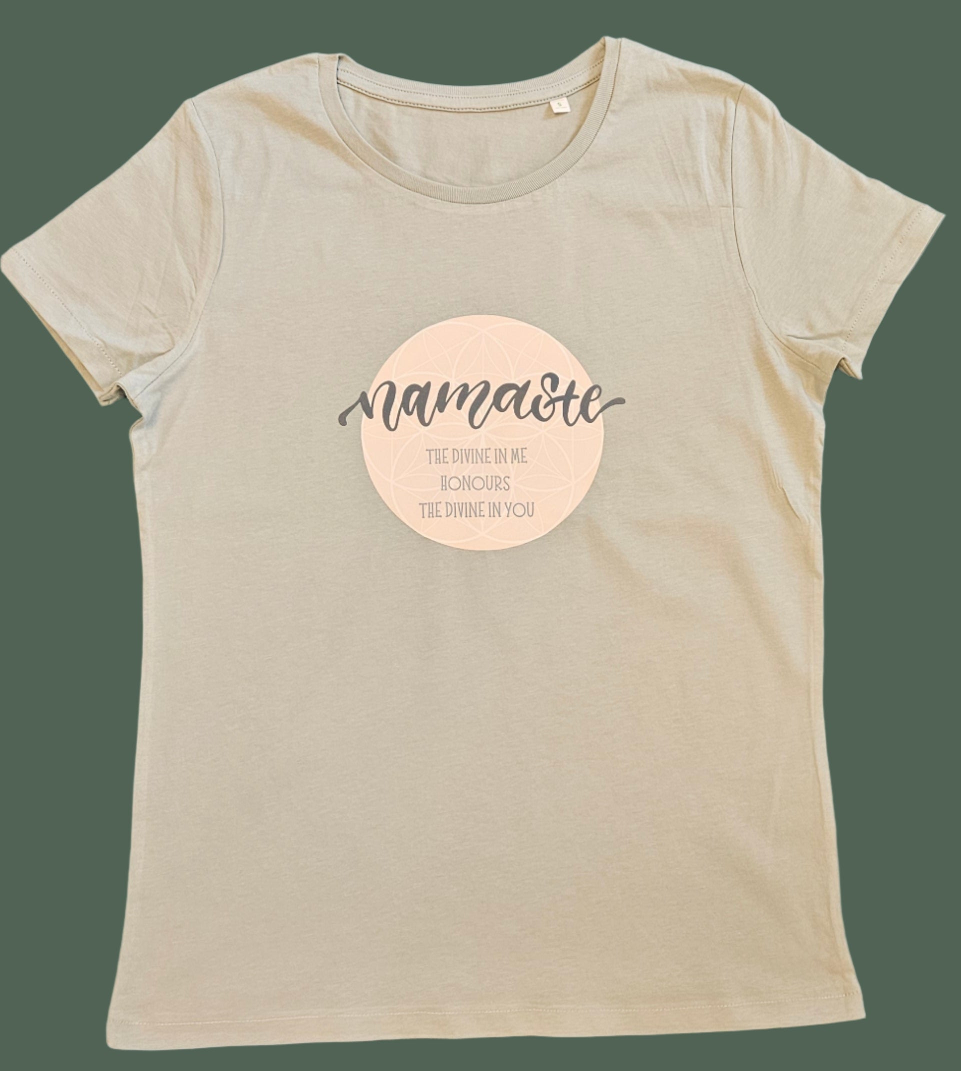 Soft in color and deep in meaning, this sage green t-shirt carries a timeless message of spiritual connection: