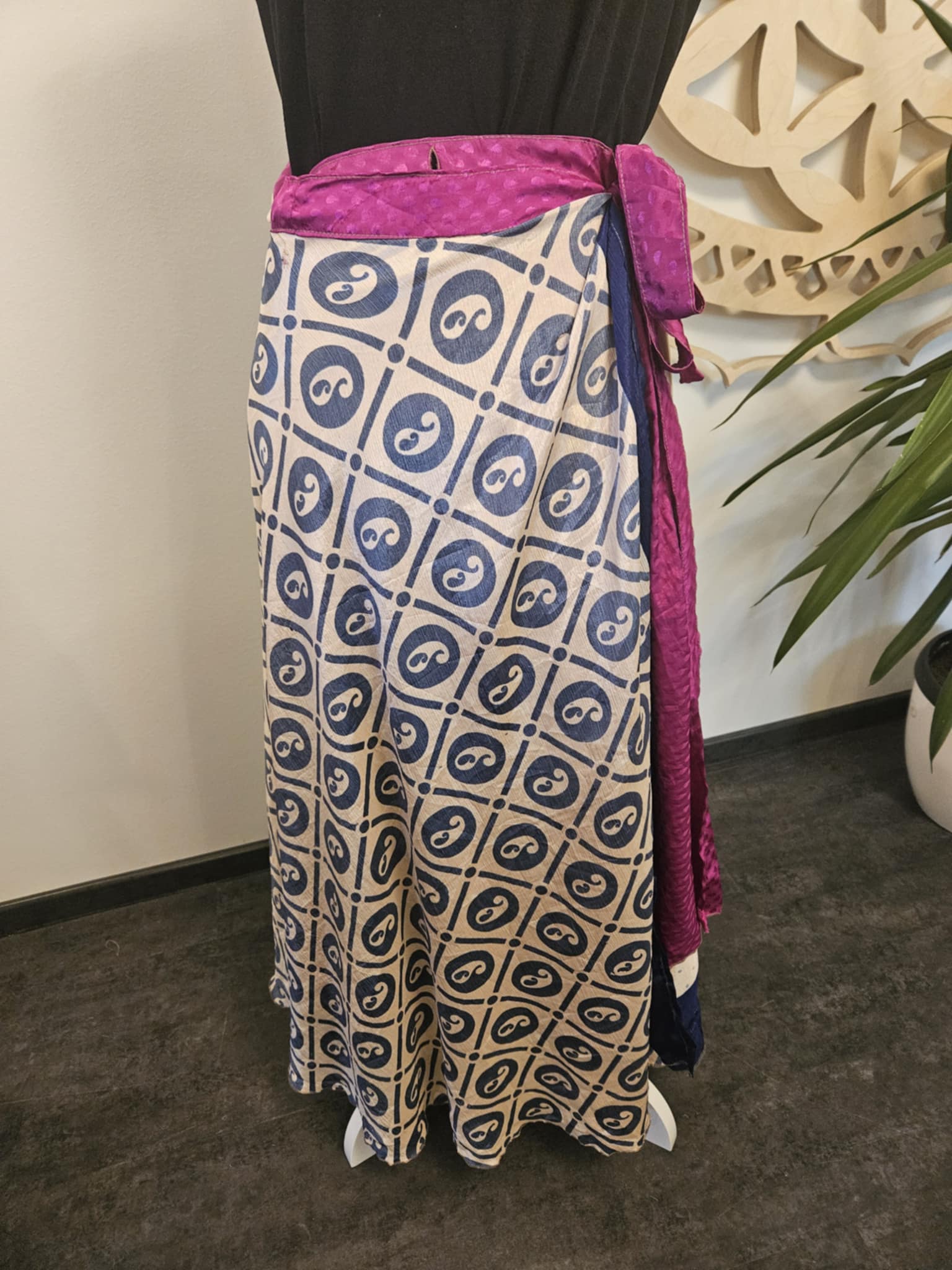 Wrap yourself in the divine energy of Shakti – the sacred feminine force of creation and transformation – with this flowing, reversible wrap skirt made from recycled sari silk. Each skirt is entirely unique, hand-sewn from vintage Indian saris, carrying the beauty and stories of another time. Wear it whole year - if cold, just put a pair of leggins underneath and - voila! You got yourself a perfect bohemian look.
