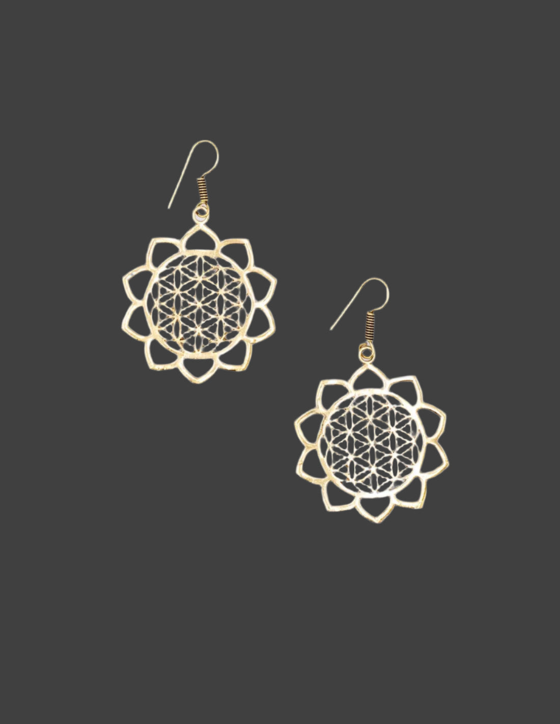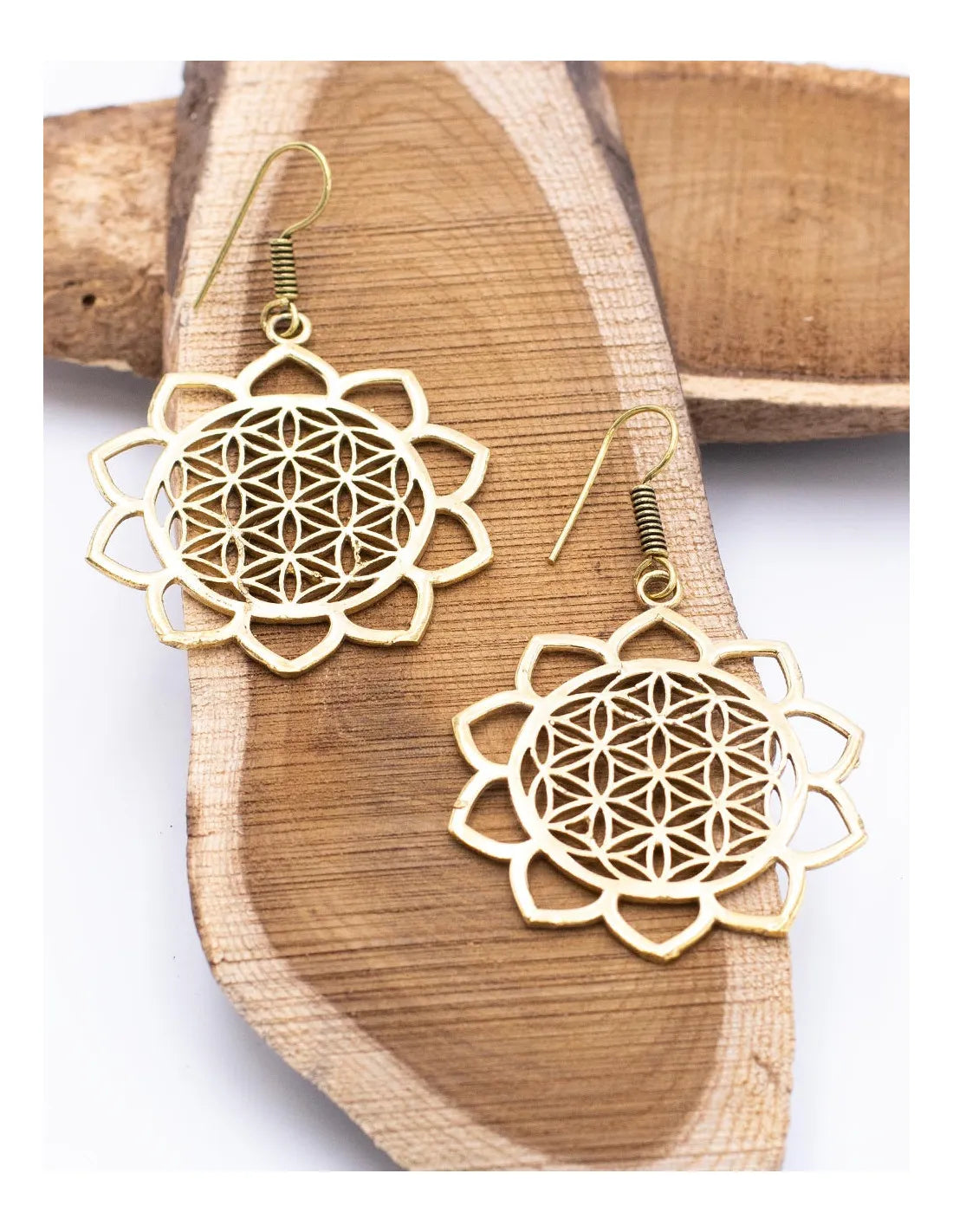 Ti izvrstni etnični uhani so ročno izdelani iz medenine (fuzije bakra in cinka ) in so v čudoviti zlati barvi . Njihova krožna oblika ima zapletene rezbarije, ki jih navdihuje mandala , z nežnimi srci, ki obkrožajo dizajn, ki simbolizira ljubezen in enotnost .