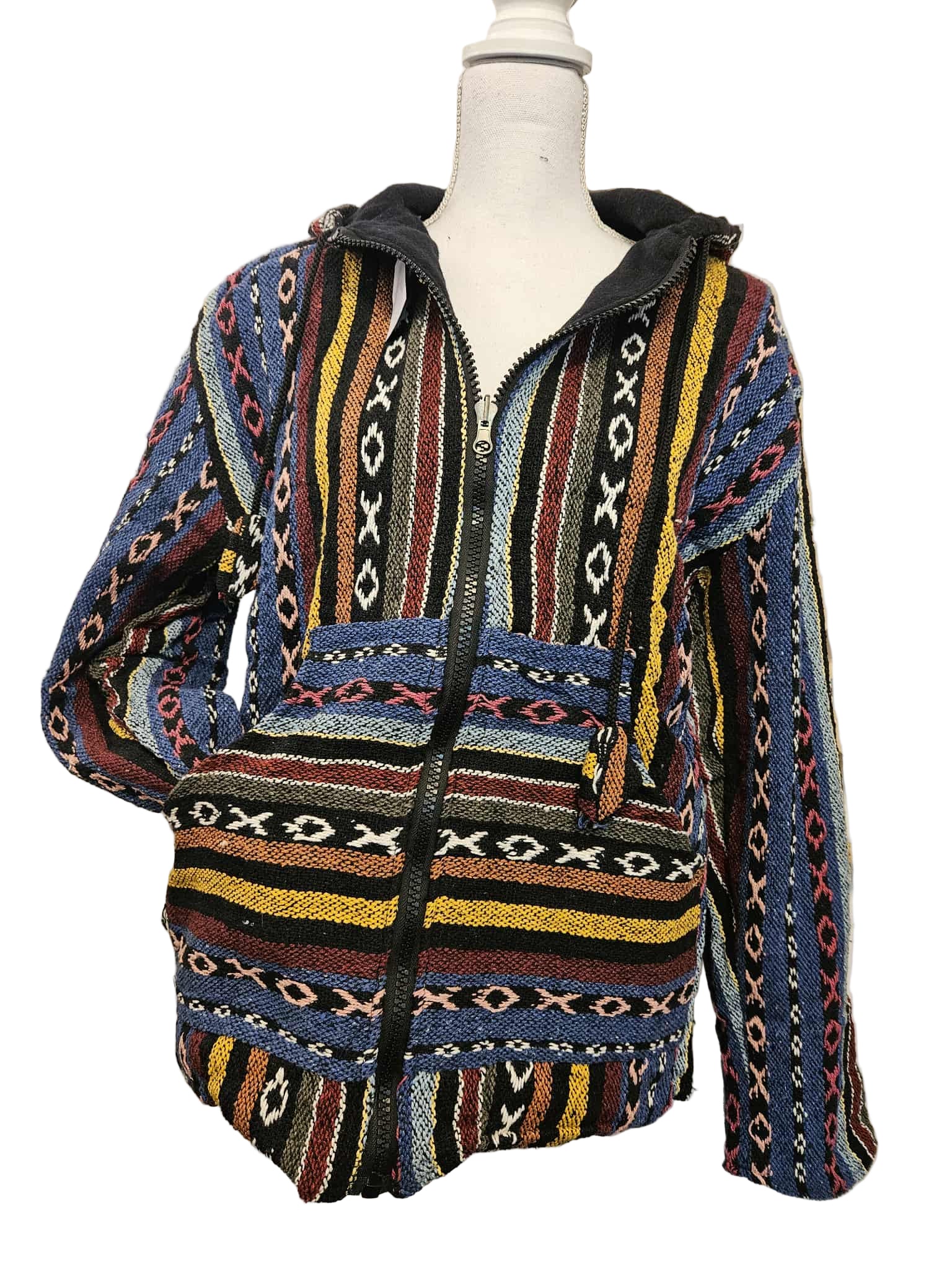 Ostanite topli in elegantni s to živahno jakno v hipijevskem slogu z barvito bombažno zunanjostjo in mehko črno flis notranjostjo za dodatno toploto in udobje. Ta udoben kos, ki je popoln za hladne dni, združuje edinstven dizajn s funkcionalnostjo.
