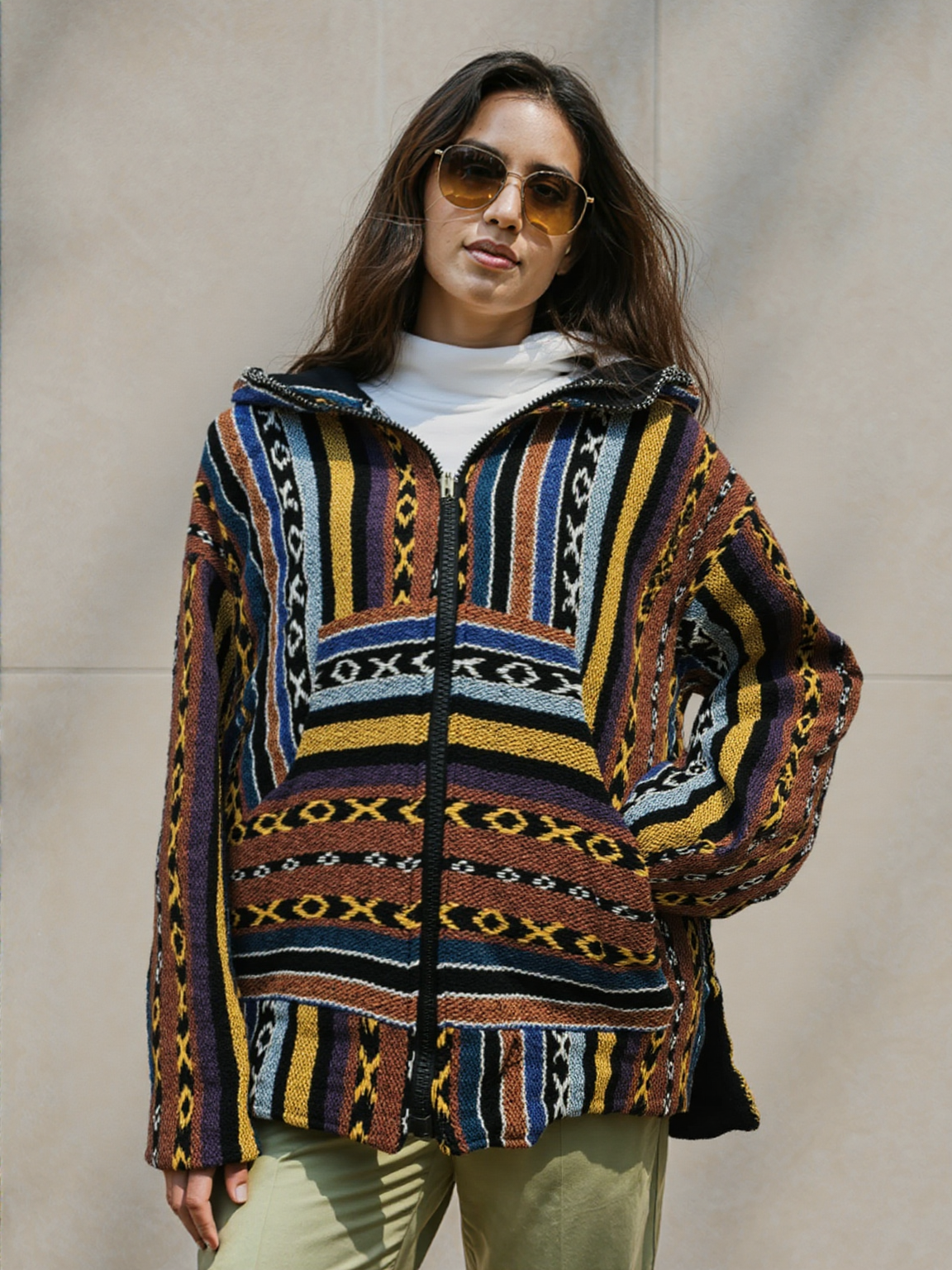 Ostanite topli in elegantni s to živahno jakno v hipijevskem slogu z barvito bombažno zunanjostjo in mehko črno flis notranjostjo za dodatno toploto in udobje. Ta udoben kos, ki je popoln za hladne dni, združuje edinstven dizajn s funkcionalnostjo.