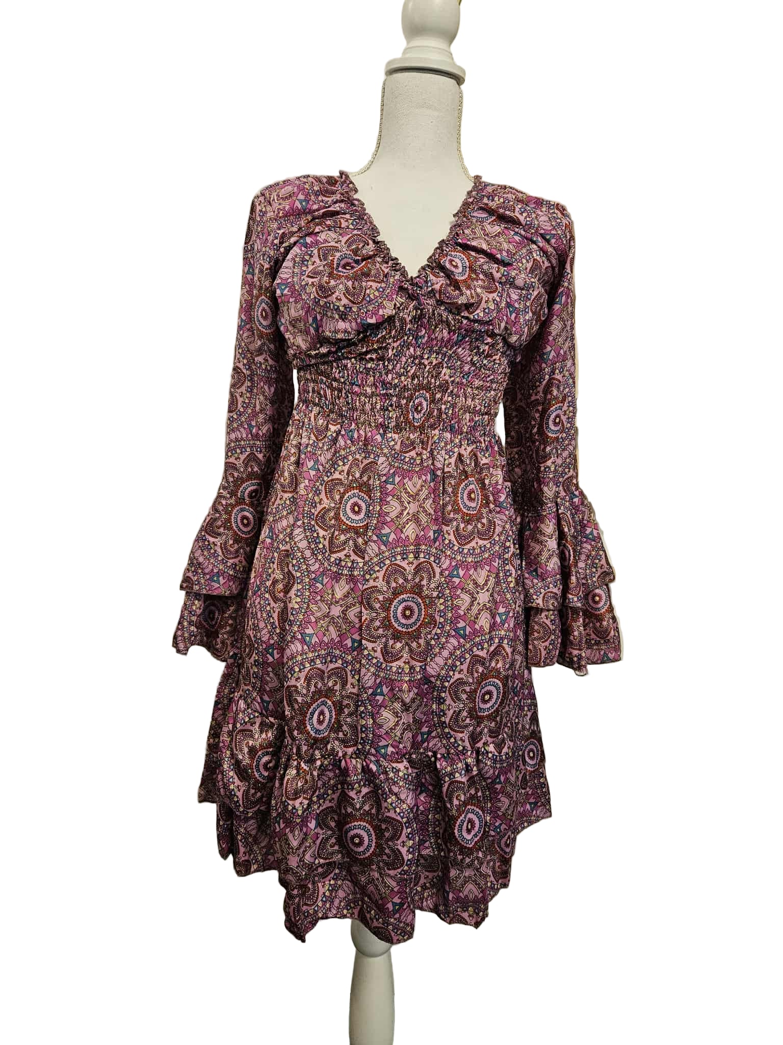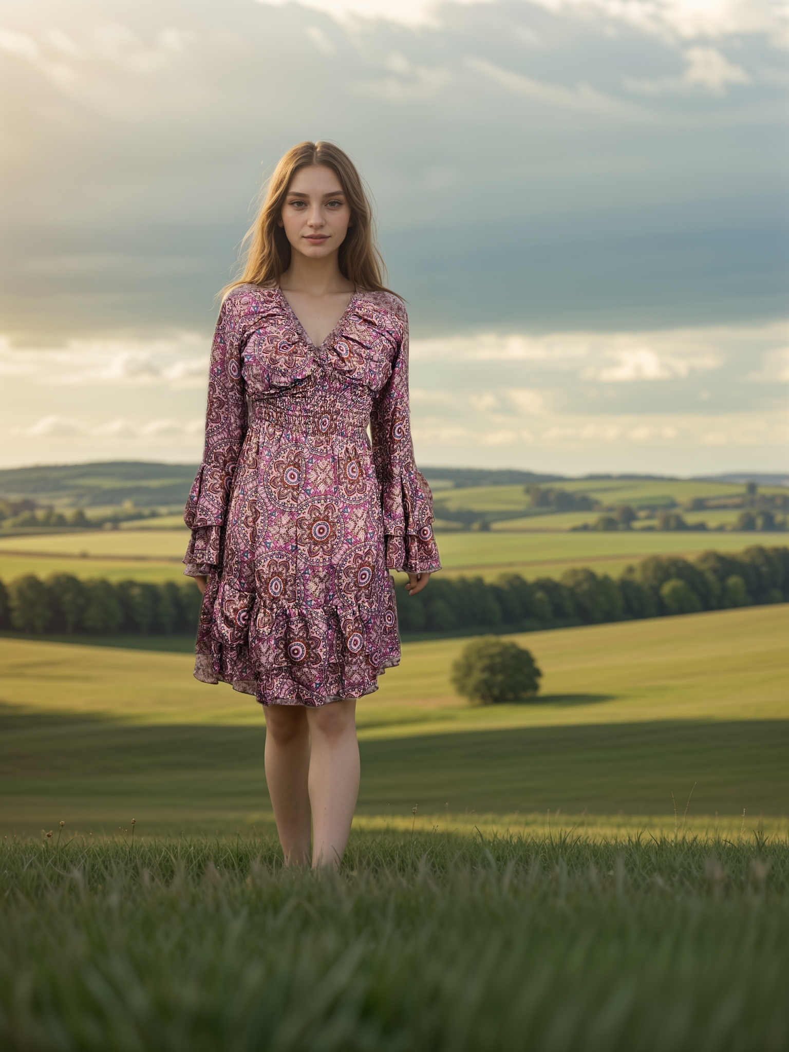 S širokimi rokavi, nežnimi volančki in zapletenimi vzorci ta obleka izžareva lahkotno eleganco in boemski čar.
