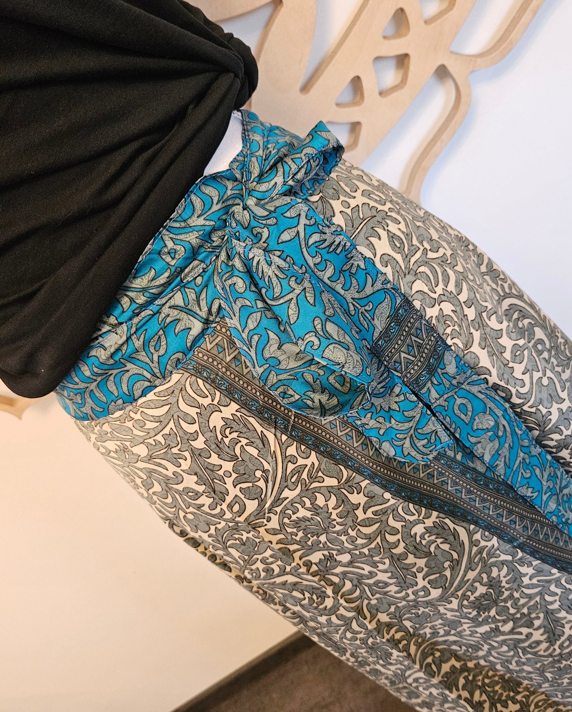 Sari je tradicionalno indijsko oblačilo, ki ga nosijo ženske – pogosto živahno, simbolično in bogatih tekstur. Ta krila so izdelana iz skrbno izbranih, rabljenih sarijev, zaradi česar je vsak kos umetniško delo, ki spoštuje tako dediščino kot trajnost.