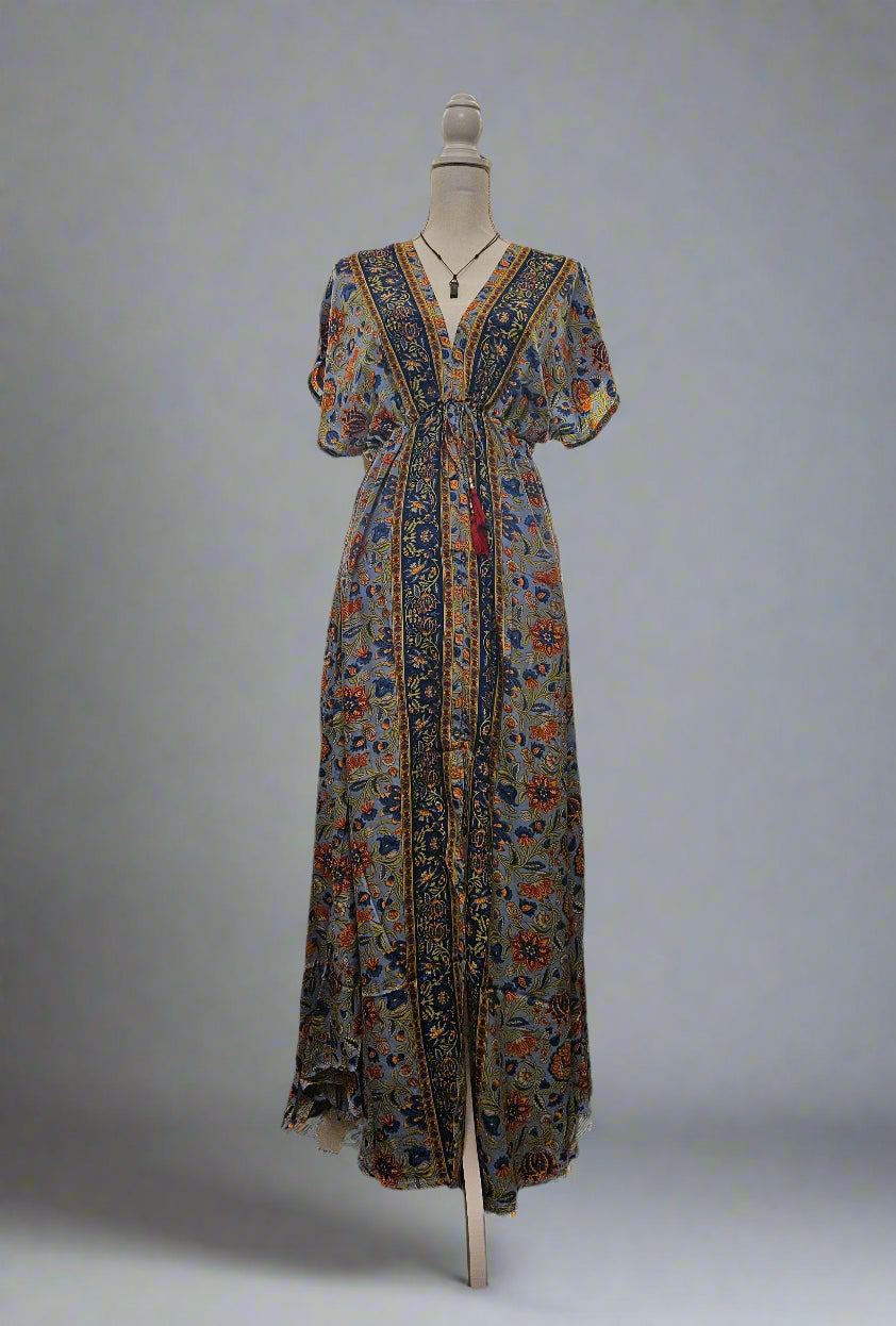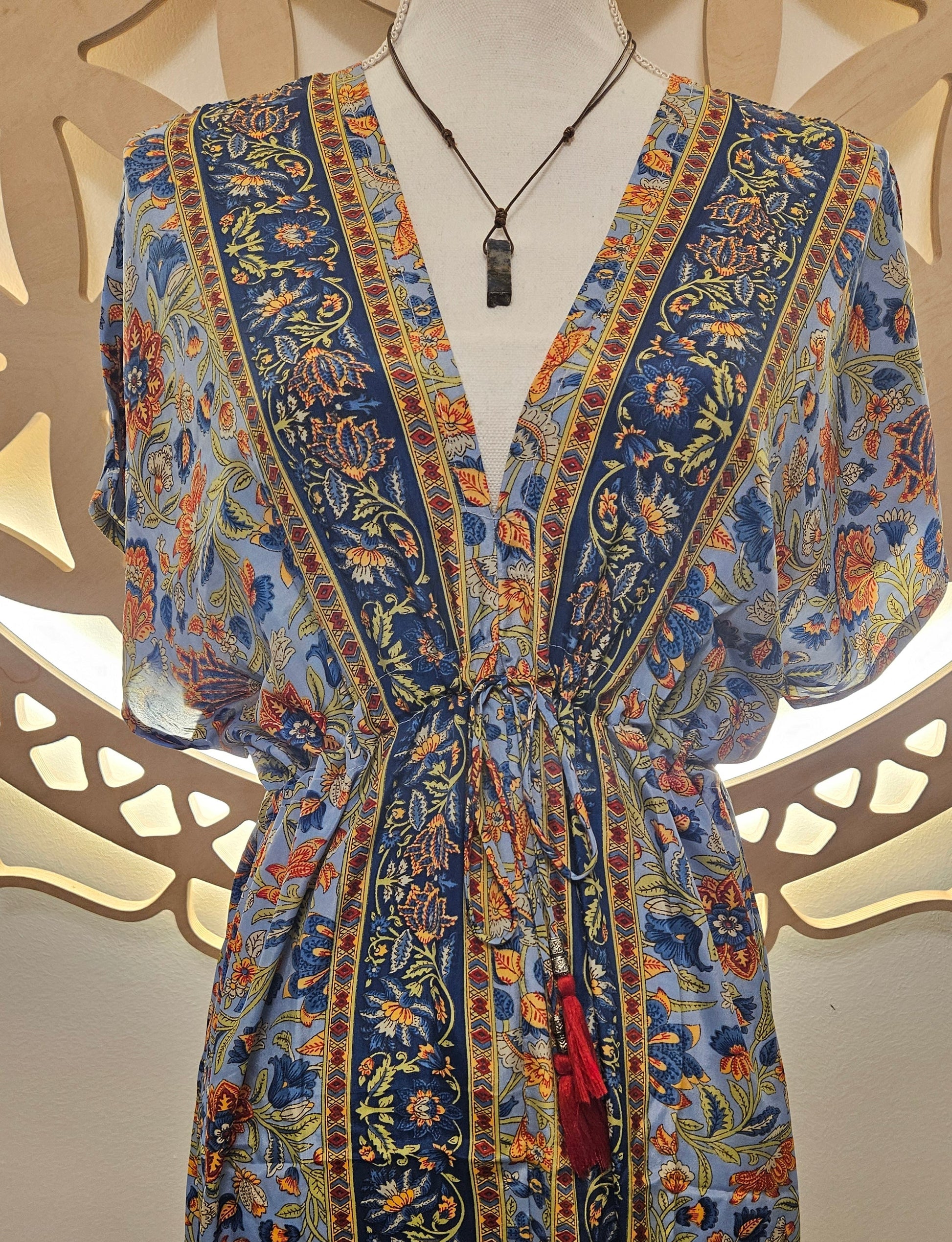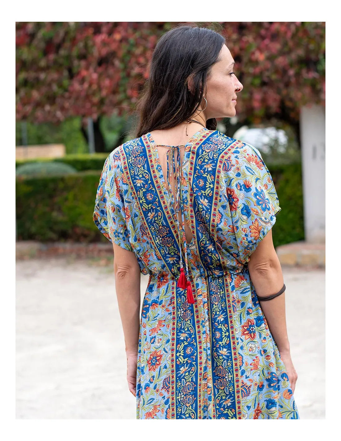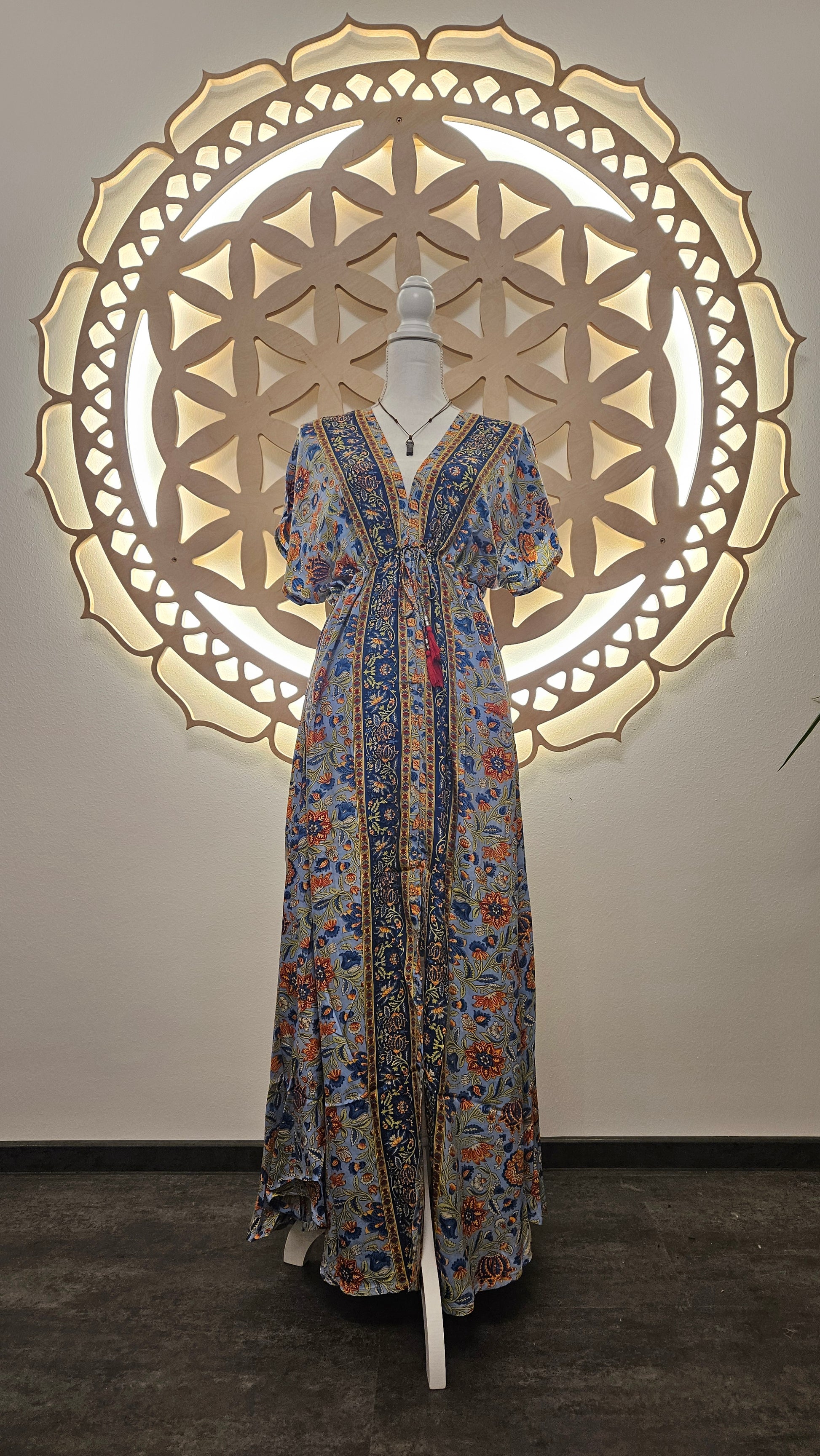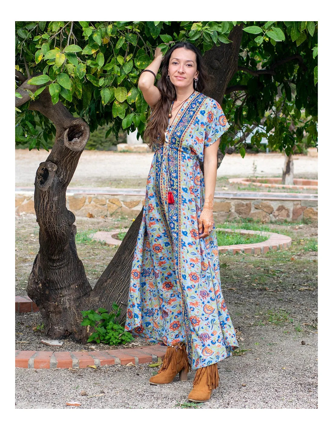 Padajoča in eterična obleka boginje Freya je izdelana iz mehke, lahke svile s svetlo modro podlago , okrašena z živahnimi modrimi, oranžnimi in zelenimi potiski. Z V-izrezom in zrcaljenim hrbtom v obliki črke V ta dolga obleka ponuja čudovit elegantno bohemski videz.