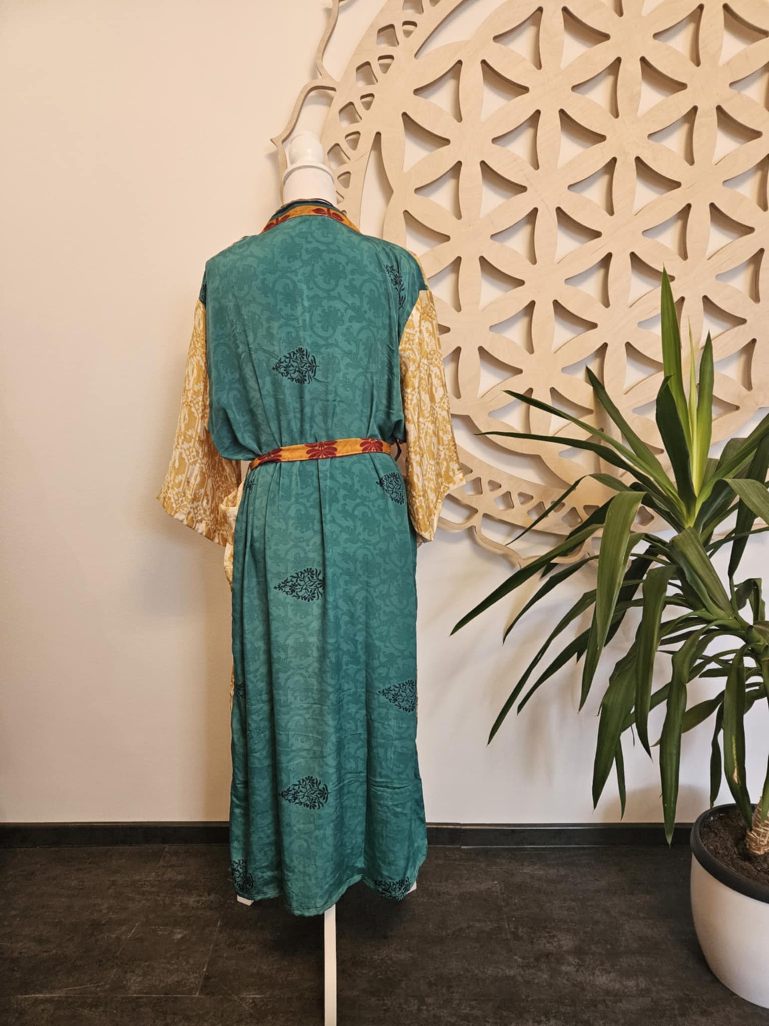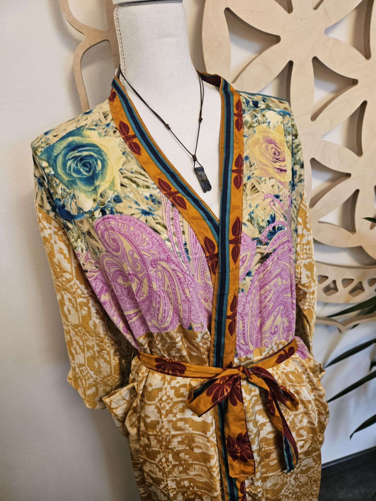 Ta boemski kimono, narejen iz svetih indijskih sarij, je poklon ženski energiji. Popoln za meditacijo 🧘♀️, ženske rituale 🔥, dneve na plaži 🌊, jesensko oblačenje v plasteh 🍂 ali v kombinaciji z kavbojkami 👖 za čuten vsakdanji videz.